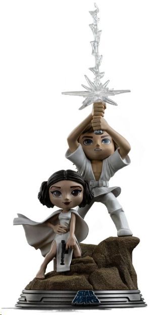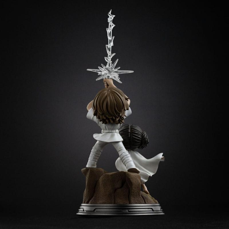 Esta minifigura de Luke y Leia de Star Wars, perteneciente a la línea Mini Co. de Iron Studios, presenta a ambos personajes en una escena llena de simbolismo y espíritu aventurero. El diseño estilizado aporta un enfoque fresco y expresivo, manteniendo la esencia heroica que define a los gemelos más icónicos de la saga.