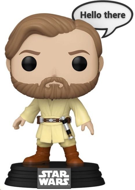 Obi-Wan Kenobi llega en una figura Pop! Vinyl con su icónica frase incluida. Con una altura de 9 cm, este Funko captura al legendario maestro Jedi en su clásica postura con su túnica beige y su sable láser colgado en el cinturón. Lo más especial de esta figura es el bocadillo de texto con la frase "Hello there", un guiño memorable para todos los fans de Star Wars.