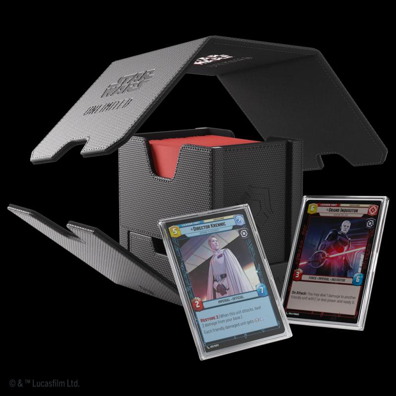 La novedosa caja TWIN SUNS Deck Pod de gran calidad y licencia oficial está diseñada específicamente para el popular formato TWIN SUNS Star Wars: Unlimited. TIENE UNA CARACTERÍSTICA ÚNICA: esta caja incluye 2 fundas Slide Card Cases con protección UV adicional para que las 2 cartas de líder estén a salvo. Gracias a la colocación de estas cartas, el mazo se podrá identificar sin abrir la caja. Las 2 fundas Slide Card Cases se pueden extraer durante las partidas.