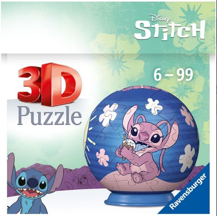 ¡El amor intergaláctico llega en forma de esfera con Angel, la compi más kawaii de Stitch! Este puzzle 3D de 54 piezas, fabricado por RAVENSBURGER, es perfecto para fans de Disney que quieran montar algo chulo y decorativo. Ideal para edades de 6 a 99 años, encaja sin pegamento y queda genial con su soporte incluido.