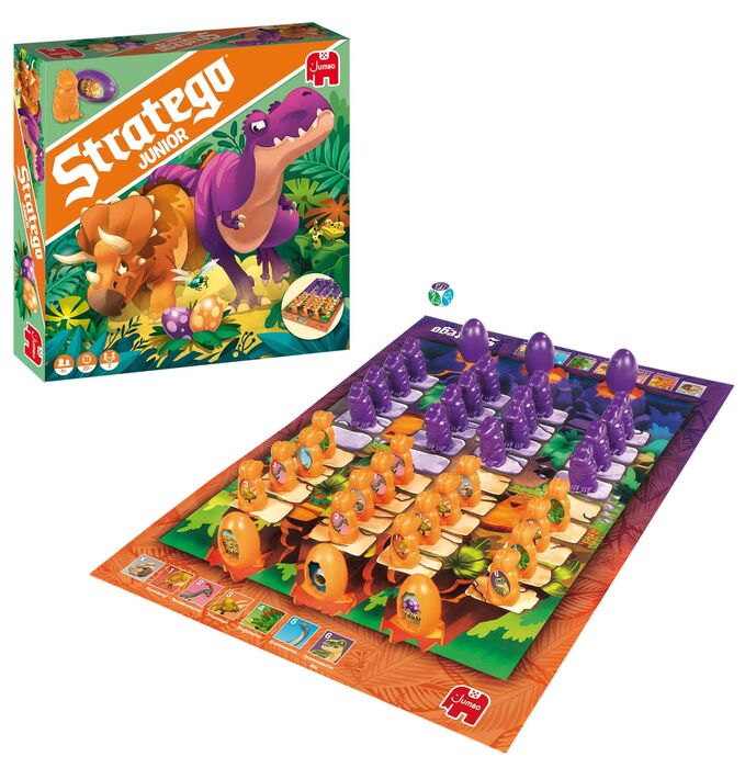 ¡Viaja en el tiempo hasta la era de los dinosaurios con el nuevo Stratego Junior Dinos! Es hora de buscar y recuperar tu huevo robado a los dinosaurios rivales que lo han escondido en uno de los tres volcanes. ¡El primero en encontrar el suyo gana la partida! Esta versión Junior incluye dos formas de jugar: