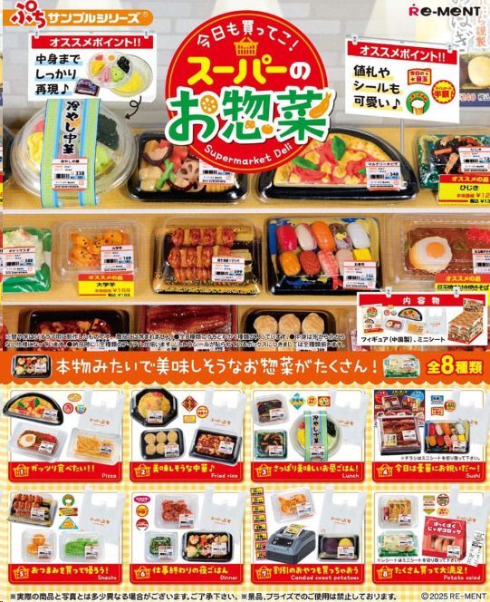 La colección incluye almuerzo, arroz frito, pizza, sushi, snacks, cena, batatas confitadas y ensalada de papa. Cada miniatura está diseñada con un nivel de realismo que hará que destaquen en cualquier colección. ¡Completa tu supermercado en miniatura con esta divertida y variada serie!