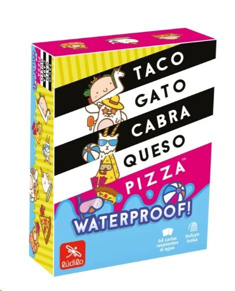 Taco, Gato, Cabra, Queso, Pizza Waterproof es un juego de cartas con el que tendréis risas y diversión aseguradas, y ahora en un formato piscinero a prueba de agua. La agilidad y sincronía mental serán clave para que te deshagas de todas tus cartas ¡Si coincide tu carta con la palabra que te toca, más te vale ser rápido!