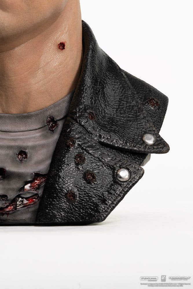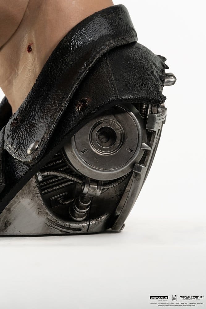 Esta réplica a escala 1:1 del T-800 Model 101 Battle Damaged Art Mask, inspirada en Terminator 2, reproduce con gran realismo el icónico aspecto dañado del endoesqueleto. Fabricada en poliresina y silicona, combina texturas y acabados que resaltan el contraste entre la piel sintética deteriorada y la estructura metálica interna, logrando una presencia impactante y muy fiel al diseño cinematográfico.
