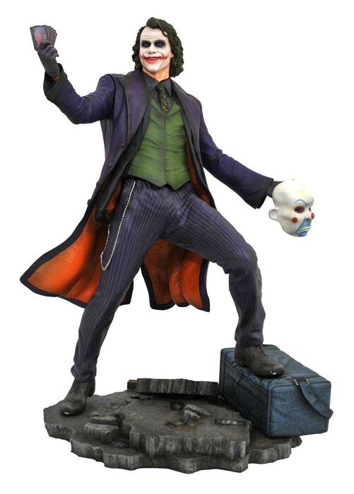 Diamond Select Toys presenta dentro de su colección DC Movie Classics Gallery esta estatua de Joker con la apariencia de Heath Ledger, tal y como aparece en la película "The Dark Knight". Muestra al Joker con un puñado de cartas en una mano, su máscara de payaso en la otra y una bolsa de dinero a sus pies.. Esta estatua mide unos 23 cm de alto, está diseñada por Shawn Knapp, esculpida por Rocco Tartamella e incluye un pequeño diorama como base para exponerla.