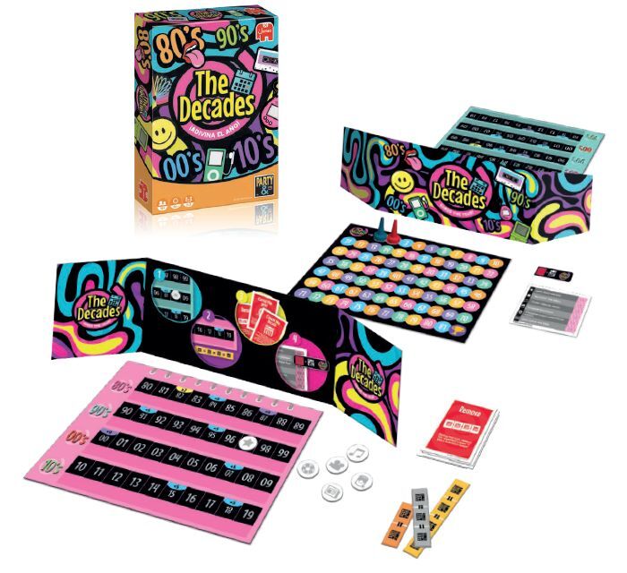 ¿Recuerdas los extravagantes años 80, los grunge 90 o incluso el famoso año 2000? The Decades es un juego de mesa con el que se viajará en el tiempo. Los jugadores desafiarán su memoria intentando recordar curiosidades, eventos, tecnología, películas... a través de las décadas. ¡Ganará el primer equipo en llegar a la meta!