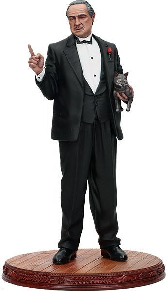 Cada detalle de la figura ha sido meticulosamente esculpido para reflejar uno de los momentos más memorables de la primera película de la saga. Desde su característico traje, su expresión serena pero decidida, hasta los pequeños accesorios que adornan su atuendo, todo ha sido cuidadosamente diseñado para asegurar una autenticidad excepcional. La figura se presenta en una elegante caja con ventana, que no solo protege la pieza, sino que también exhibe el entorno recreado del fondo de la escena, transportando al coleccionista directamente al corazón de la icónica trama del Padrino.