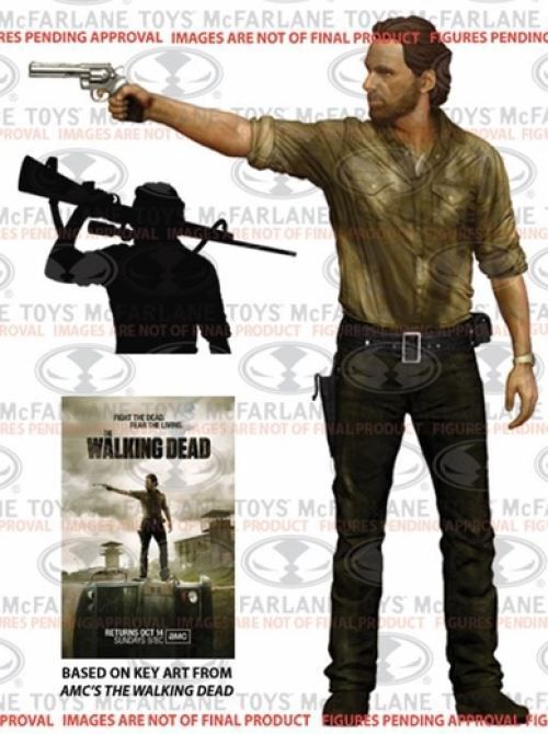 De la aclamada serie de cómics de Robert Kirkman y de la no menos popular y recientemente estrenada adaptación en forma de serie para la televisión, McFarlane nos trae esta figura en formato Deluxe del protagonista de la serie televisiva The Walking Dead: el oficial Rick Grimes en su versión de la tercera temporada. Esta figura de PVC mide 12.70 cm y representa fielmente al actor que encarna a este personaje. Incluye pistola, rifle y manos intercambiables.