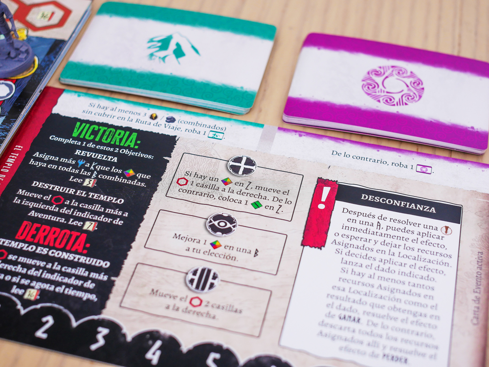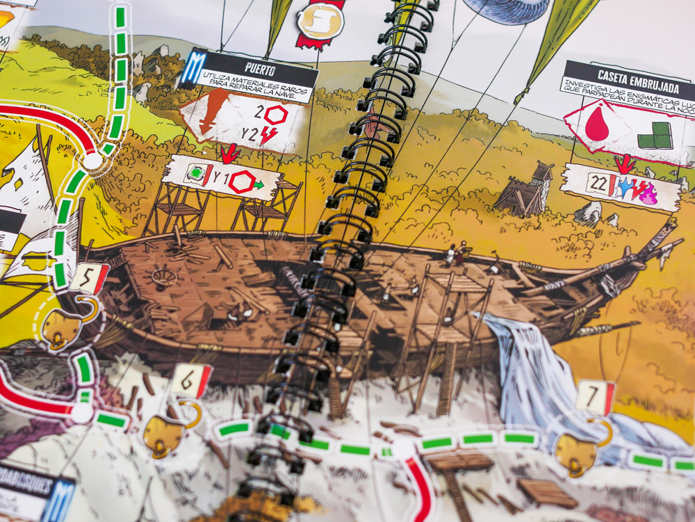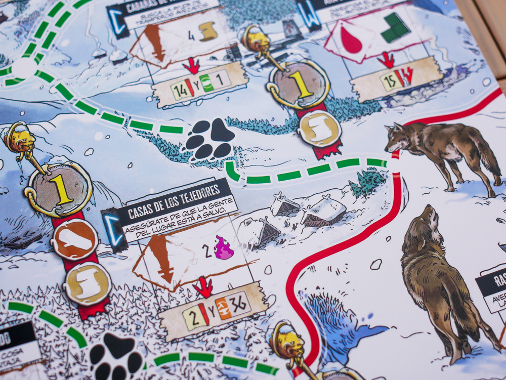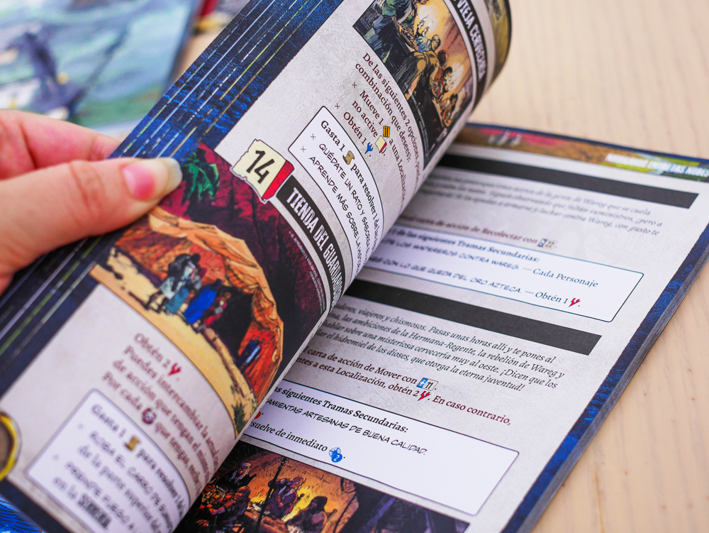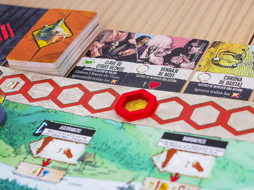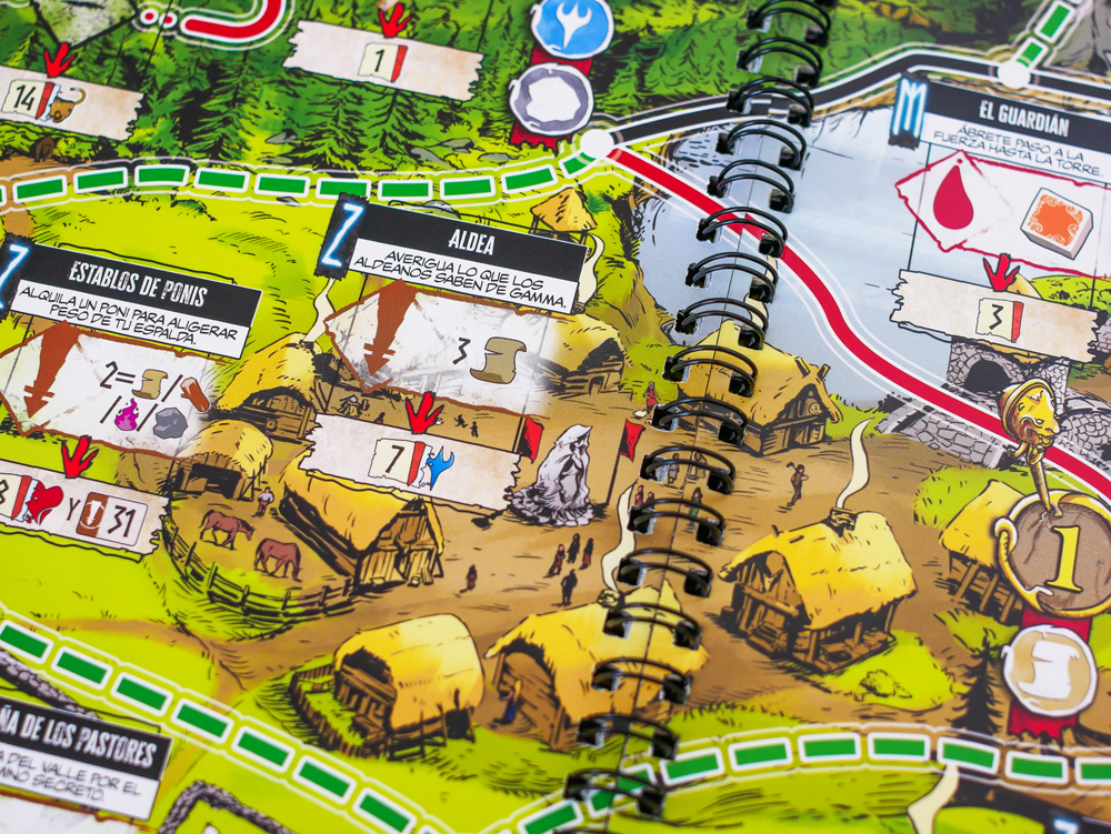 COMPONENTES: 1 Atlas de Aventuras (incluye 7 Aventuras rejugables) 1 Libro de Relatos 4 hojas de Aventura 4 miniaturas 4 tableros de Personaje 4 discos de acción 12 dados personalizados 100+ fichas de madera 150+ cartas de 63×88 mm (Enemigo, Terreno, Acción, Evento ) 40+ cartas de 44×68 mm (Objeto, Descubrimiento ) 250+ fichas y losetas (Herida y Viaje, Enemigo, Bloqueo, Entrada, Amenaza ) 1 reglamento