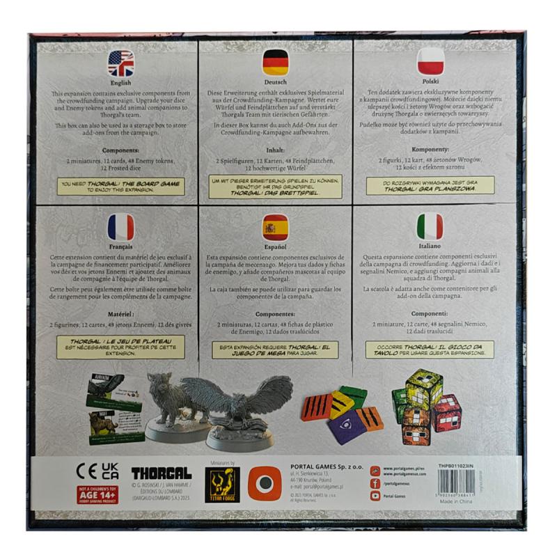 Esta expansión contiene componentes exclusivos de la campaña de mecenazgo. Mejora tus dados y fichas de enemigo, y añade compañeros mascota al equipo de Thorgal.