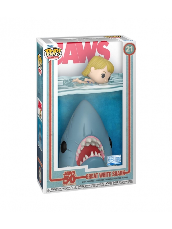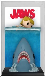 Esta figura Pop! recrea el icónico cartel de la película Tiburón con un estilo adorable y aterrador al mismo tiempo. La escena muestra al gran tiburón blanco emergiendo desde las profundidades, directamente hacia una desprevenida nadadora, todo encapsulado en un diorama vertical que imita el póster original con gran fidelidad.