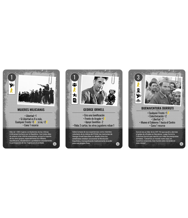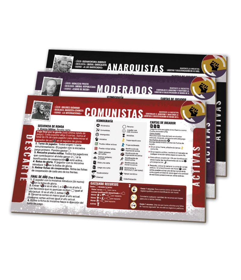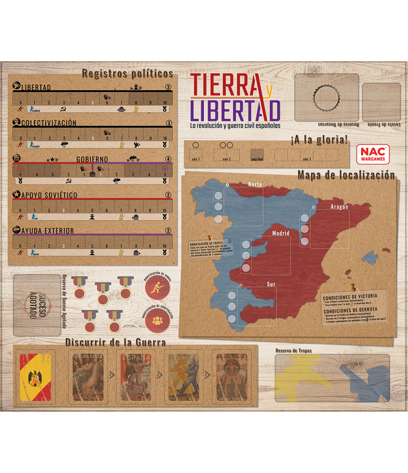 Tierra y Libertad La Revolución y Guerra Civil Españolas es un juego con motor de cartas en el que los jugadores se ven inmersos en el dilema de equilibrar la frágil alianza entre anarquistas, comunistas y moderados con sus propios ideales políticos y revolucionarios. Deberás repeler el ataque fascista en los 4 Frentes, mientras ganas la Iniciativa a través de la construcción de cuadros, la gestión de mazos y los poderosos Medallones.