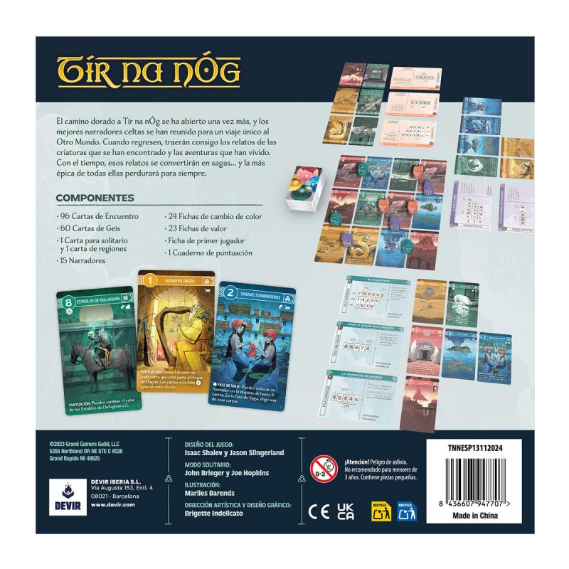 Diseñado por Isaac Shalev y Jason Slingerland, Tír na nÓg se puede disfrutar en solitario o en grupos de hasta 5 jugadores, a partir de 10 años, en sesiones de unos 45 minutos de duración. A través de mecánicas de gestión de mano y colocación de trabajadores, los jugadores competirán por sumar la mayor cantidad posible de puntos formando una saga única en su zona de juego con las cartas de relato.