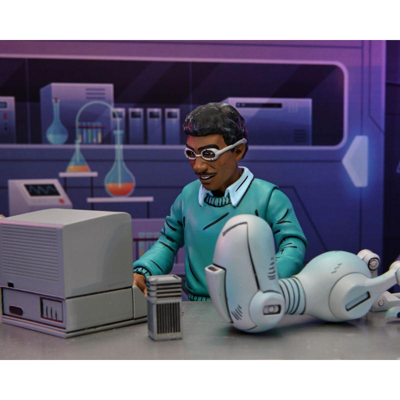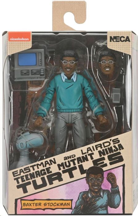 La figura de Baxter Stockman viene equipada con una serie de accesorios que enriquecen su valor coleccionable y funcionalidad. Incluye un Mouser, el infame robot insecto que Stockman utiliza en sus planes malvados, así como una cabeza adicional para ofrecer opciones de personalización. Además, Baxter viene con dos pares de manos intercambiables, un ordenador para simular sus intrincadas máquinas y un edificio en miniatura que añade un toque de contexto a sus escenas de villanía. Cada uno de estos elementos está diseñado con precisión para complementar y expandir la experiencia de exhibición.