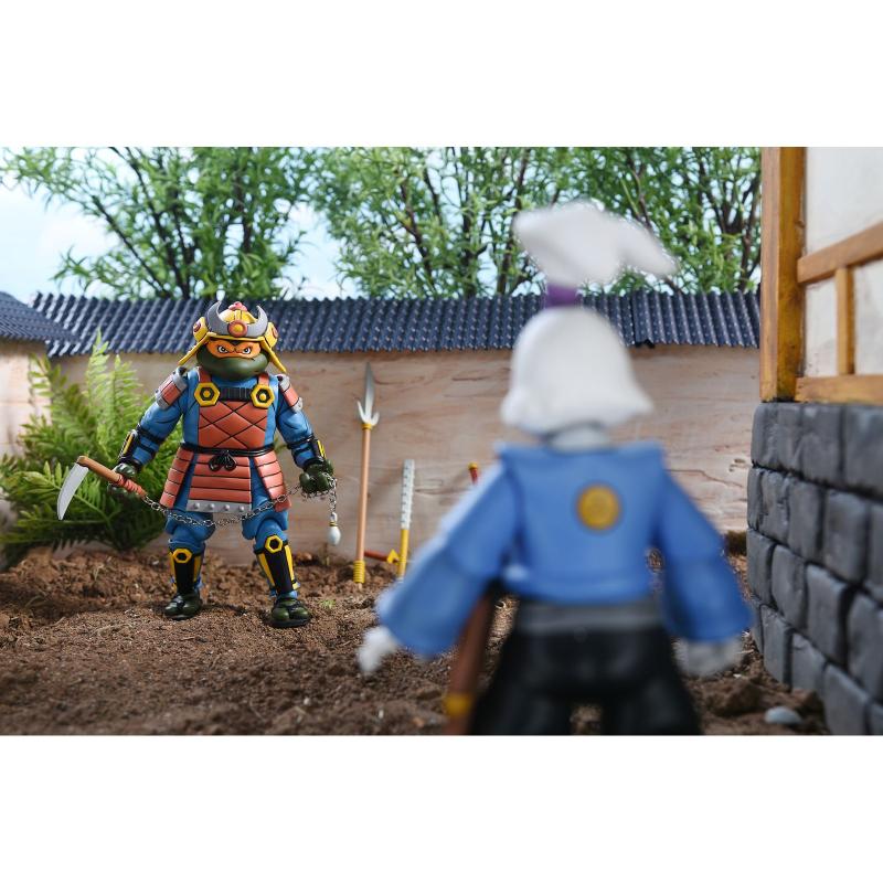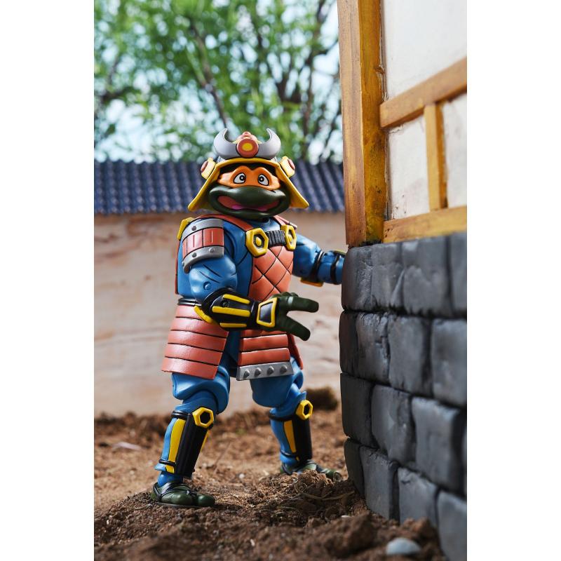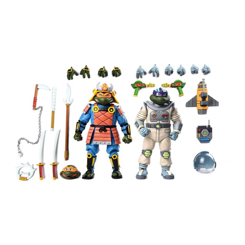 Cada figura viene equipada con una impresionante gama de accesorios que enriquecen la experiencia de juego y exhibición. Michelangelo incluye dos pares de manos intercambiables, una cabeza adicional, y una variedad de armas como una lanza, un kurasigama, un tetsubo, un chakram y dos katanas. Donatello, por su parte, cuenta con tres pares de manos, un casco, gafas, una mochila acoplable, un cohete y dos blásters cósmicos de maíz, permitiendo a los coleccionistas recrear escenas tanto de aventuras espaciales como de combate samurái. Además, las cabezas de las figuras son compatibles con otras figuras TMNT de Neca (se venden por separado), añadiendo aún más versatilidad a la colección.