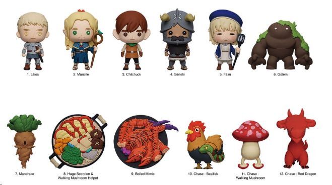 Estos colgantes de PVC de Tragones y Mazmorras Serie 1 trasladan el universo de Delicious in Dungeon a un formato compacto y lleno de detalle, ideal para llevar como llavero o colgante decorativo en mochilas, estuches o llaves.