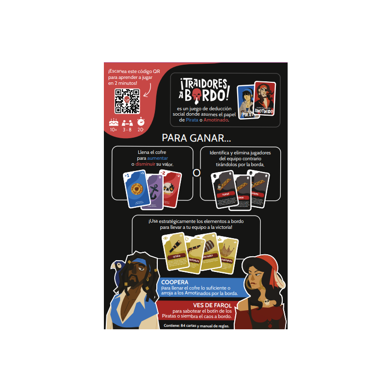 Traidores a bordo es un juego de roles ocultos que combina estrategia, engaños e interacciones sociales. En Traidores a bordo, asumes el papel de un pirata que intentará llenar el cofre de la tripulación o de un amotinado que hará todo lo posible para sabotear el botín.