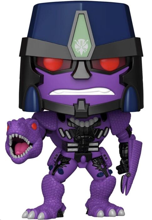 Esta figura Pop! de Megatron en su versión Beast Wars es una poderosa representación del líder de los Predacons en su forma de tiranosaurio. Con sus característicos tonos morados, la figura mezcla rasgos robóticos y orgánicos, destacando la cabeza de dinosaurio que forma parte de su brazo derecho, con la boca abierta y llena de dientes afilados, lista para atacar. Sus ojos rojos y expresión feroz reflejan su dominio y agresividad.