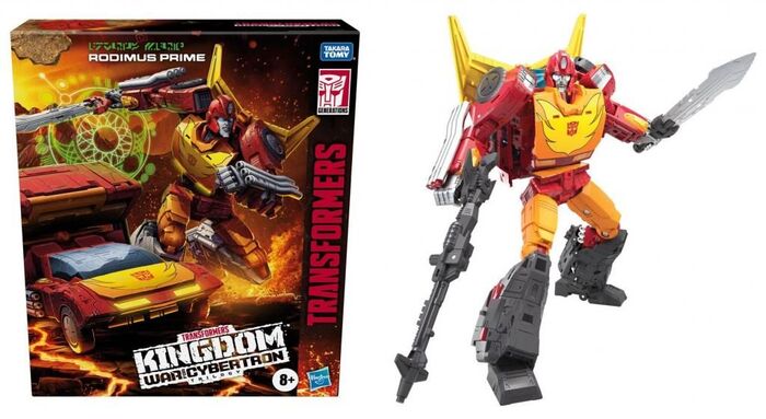 Hasbro presenta dentro de la colección War For Cybertron Kingdom Commander Class la figura del autobot Hot Rod en su evolución tras ser merecedor de portar la Matriz en su versión Rodimus Prime con el aspecto de la serie G1 original. Esta figura articulada mide unos 19 cm de alto en su forma robot. Se convierte de modo robot a coche de carreras en 34 pasos. El trailer remolque que lleva también se transforma en una base de defensa con un lanzador de misiles en 8 pasos. Incluye espada de Primus inspirada en los comics y un disco dorado que revela el destino de un posible personaje clave en la batalla.