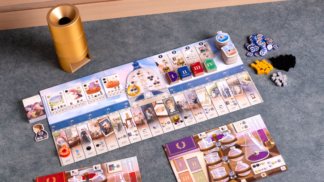 Componentes: 1 torre de cubos, 1 tablero principal, 4 tableros personales, 47 cartas de actividad, 24 losetas de experimento, 16 fichas de tesis, 5 losetas de objetivo, 3 losetas de taller, 54 cubos de recurso, 29 fichas de puntos de victoria, 1 loseta de Marie Curie, 1 marcador de línea temporal, 1 marcador de taller, 1 ficha de turno inicial, 1 bolsa de tela, 1 reglamento, 1 libro de apéndices.