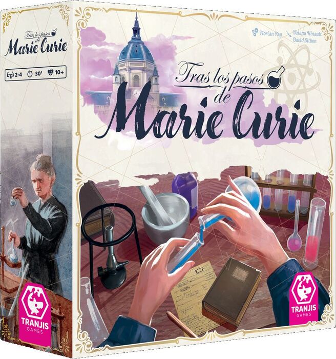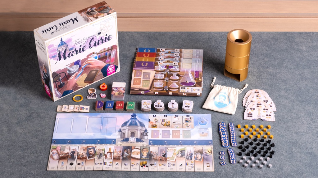 Marie Sklodowska, más conocida como Marie Curie, fue una científica pionera en el campo de la radiactividad y una de las mayores estudiosas de la historia. Tras los pasos de Marie Curie es un juego familiar, ideal para iniciarse en las mecánicas de planificación, en el que las personas investigarán en sus laboratorios y ganarán premios Nobel. El punto diferencial reside en la torre donde lanzaremos los cubitos, la cual simula el proceso de un experimento científico. Deberemos planificar bien nuestras acciones y decidir con cautela para poder maximizar nuestros experimentos y resultados.