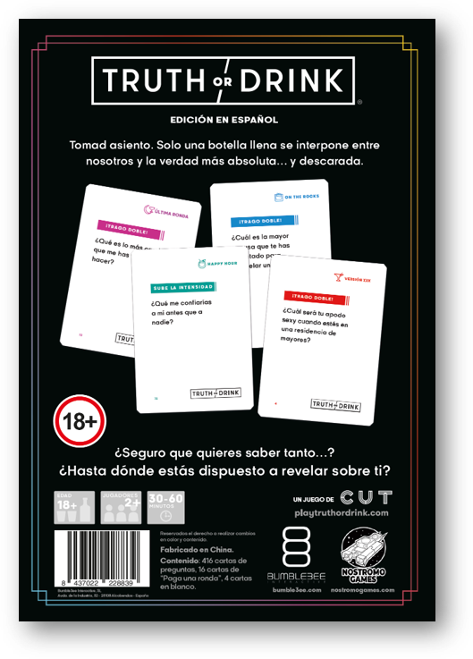 Truth or Drink Segunda Edicion es un juego de cartas ideal para animar cualquier fiesta, en el que los jugadores se enfrentan a 410 preguntas muy personales distribuidas en cuatro niveles de intimidad que permiten conocer mejor a las personas con las que juegas.