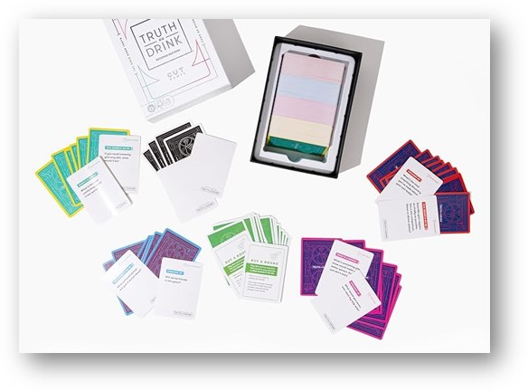 El juego incluye además cartas Buy a Round que permiten que mas personas respondan a una pregunta y cartas en blanco para crear preguntas propias, planteando siempre el dilema entre decir la verdad o beber.