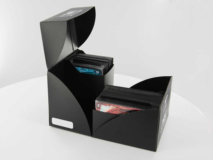 Caja de plástico para un máximo de 160 cartas de tamaño estándar (por ejemplo, las cartas de Magic the Gathering o Pokemon) en doble funda o más de 200 en fundas únicas.