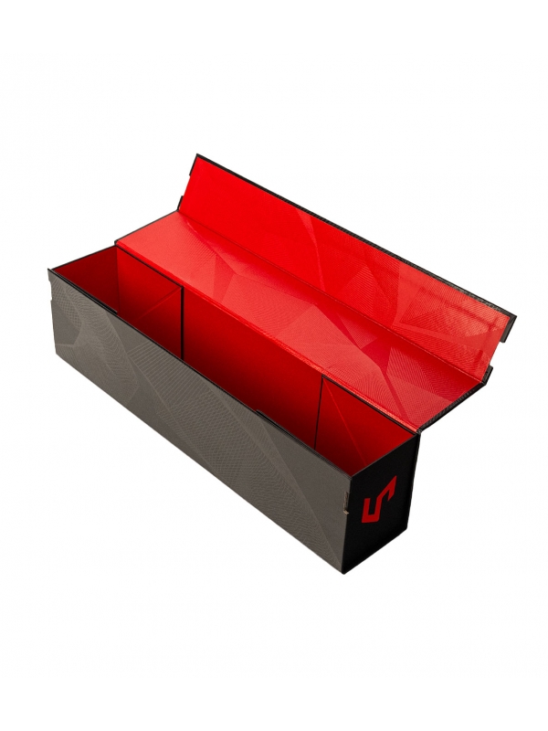 Con capacidad para hasta 500 cartas con doble funda o 800 sin enfundar, esta caja ofrece una gran versatilidad. Además, permite almacenar hasta 4 deck box de tamaño 100+ o incluso 3 tapetes de juego, adaptándose a diferentes necesidades de los jugadores y coleccionistas.