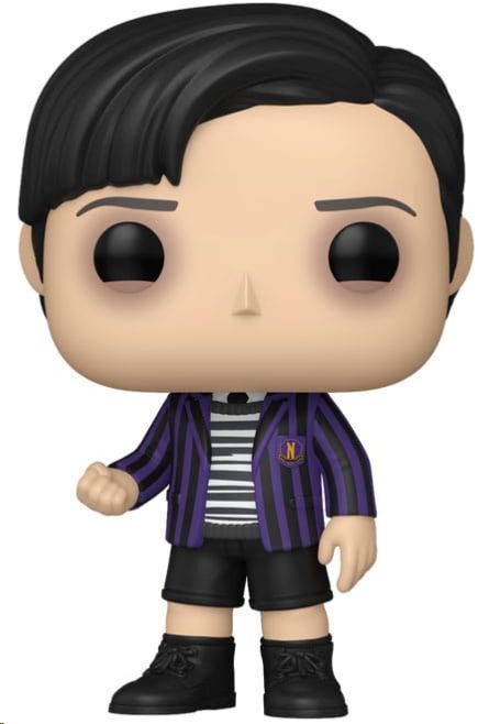 Esta figura Pop! de 9 cm presenta a Pugsley Addams con un estilo renovado inspirado en la serie Wednesday. Viste una chaqueta morada con rayas negras y el escudo de Nevermore, combinada con una camiseta de rayas blancas y negras, pantalones cortos y botas negras.