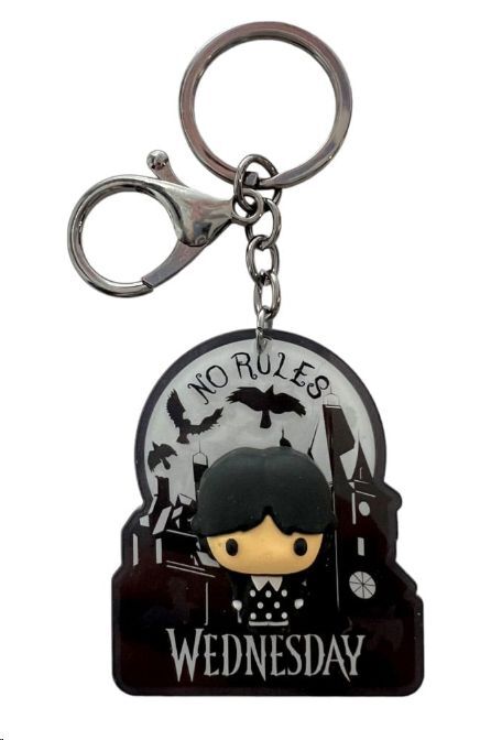 Llavero 3D acrílico de Wednesday , perfecto para los fans de la icónica hija de los Addams. Con un tamaño aproximado de 5 cm, este llavero presenta un diseño único que combina la silueta de Wednesday Addams con el misterioso mensaje "No Rules", acompañado de detalles oscuros y góticos.