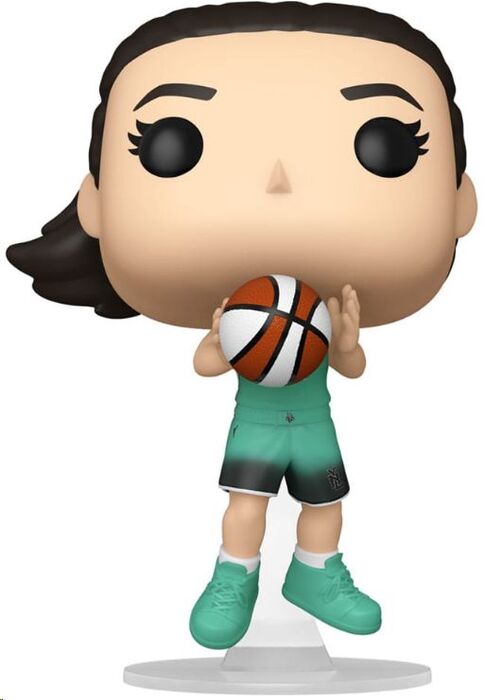 La figura Pop! Vinyl de Breanna Stewart, representante de New York Liberty, es una pieza que captura a la perfección la clase y potencia de una de las jugadoras más completas de la WNBA. Vestida con el uniforme verde icónico del equipo, aparece en pleno salto con el balón en las manos, lista para encestar con precisión.
